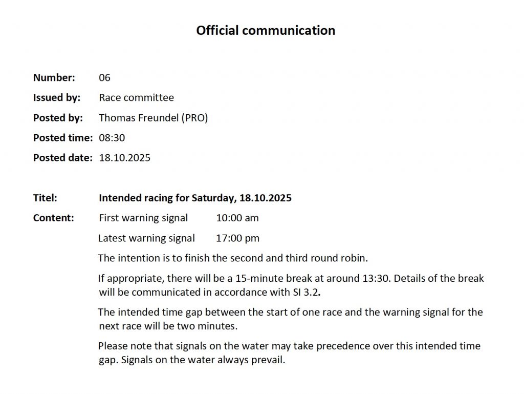 As agreed on in the Teamleader meeting with the Race Committee on Saturday evening at 6:00 pm, Race Format on Sunday, 19 October will consist of a round robin for teams ranked 5 to 10 after the first 3 round robins and the Grand and Small finals in best of 5 series for the teams ranked 1 to 4 after the first 3 round robins. For the placement of the teams from 5 to 10, points of the first 3 round robins will be carried on. The races of the finals will not start before 12:00 pm. See her for the details and the pairing lists.